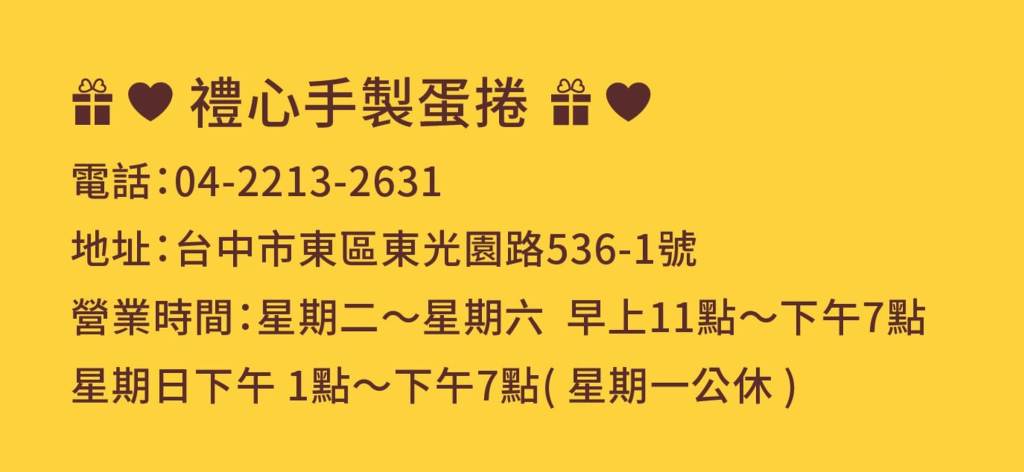 門市資訊 禮心手製蛋捲 用心,就是不一樣 不平凡的幸福滋味,就從最初的選擇開始 台中總店 星期一已關閉星期二11:00:00 – 19:00:00星期三11:00:00 – 19:00:00星期四11:00:00 – 19:00:00星期五11:00:00 – 19:00:00星期六11:00:00 – 19:00:00星期日13:00:00 – 19:00:00 靠近台中火車站、帝國製糖廠、樂業寵物公園、樂成宮 (旱溪媽祖廟) 公車資訊:樂業建成路口 241, 61, 32, 242 公車資訊:建成樂業路口 18, 19, 20 地址:台中市東區東光園路536-1號 分享此文: 分享到 X(在新視窗中開啟) X 分享到 Facebook(在新視窗中開啟) Facebook 喜歡 正在載入...